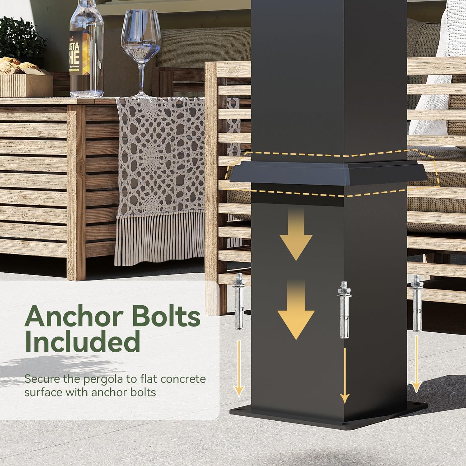 Structural Patent for Easy Assemble: Featuring a unique, patented plug-and-play frame design that eliminates the need for screw hole alignment, the metal pergola simplifies installation dramatically. It uses remarkably fewer screws—under 100 total, compared to the 100-200 required by similar models—significantly reducing your assembly time and effort Adjustable Louvered Roof: Equiped with a foldable crank handle, the patio pergola eliminate the traditional dangling design for a more aesthetically pleasing look. This also effectively prevents children from bumping their heads. The handle allows both clockwise and counterclockwise rotation for smooth and flexible blind control Premium Material: Designed for harsh American weather like humidity, rain, and intense sun, our product's frame is built with AlMgZn-coated steel that effectively resists rust, corrosion, and UV damage. Combined with the inherent impact resistance and durability of the steel core, it requires minimal maintenance and stands strong outdoors for years, offering a worry-free solution to the short lifespan of cheaper alternatives Design of Drainage System: This louvered pergola features a drainage system that can avoid from water accumulation. The roof is designed with a slope in the middle, and accumulated water drains through the beams to the columns and flows to the ground Multifunctional and Versatile: This product is much practical, offers reliable protection against harsh sunlight, rain, and strong winds. Also, it can be used as an outdoor dining area, a gathering spot for social events, or a relaxing space for lounging and enjoying nature.