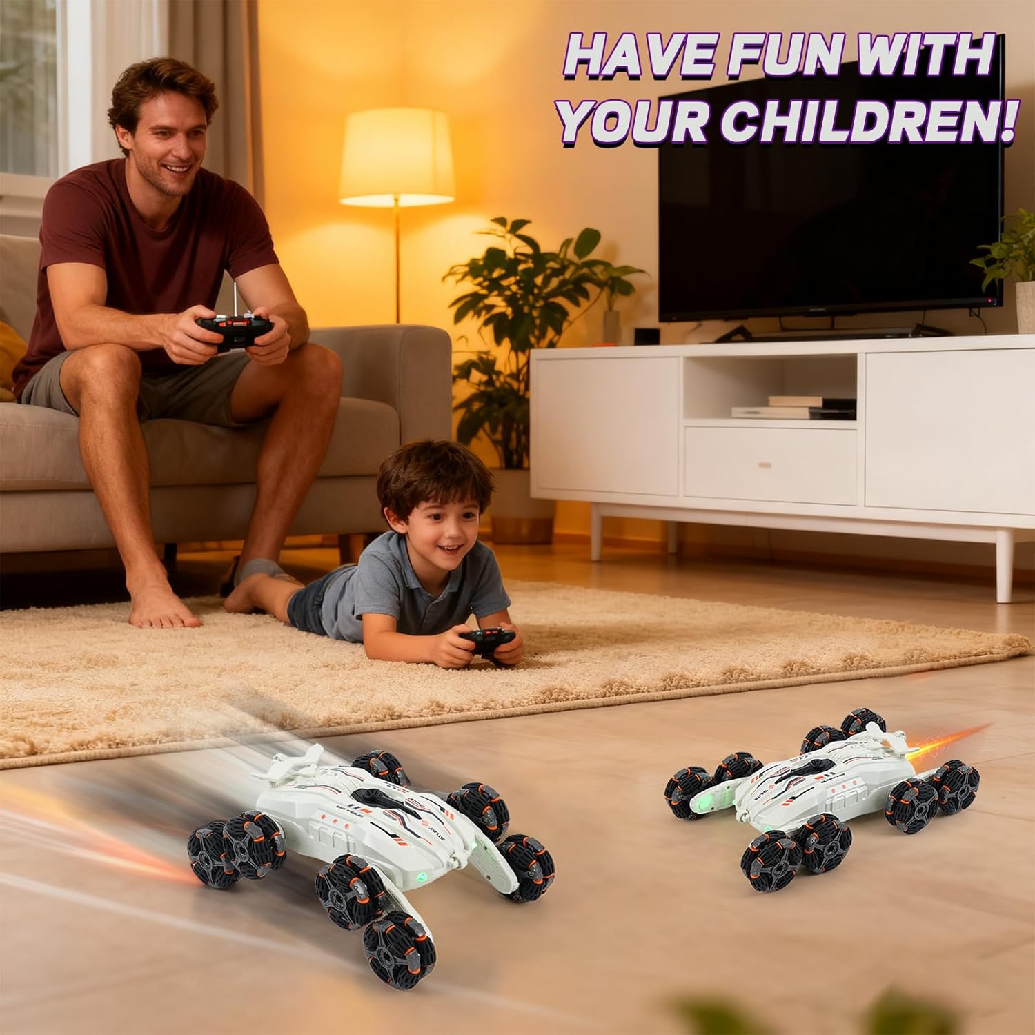Constructed with high-quality materials, this remote control car is built to withstand various environments and promote hand-eye coordination and physical skills. Whether your child is embarking on a solo adventure or engaging in interactive play with family and friends, this RC stunt car is the perfect choice for family activities and social bonding. Give your child the gift of innovative play and endless fun with our 8-Wheel Gesture Sensing RC Stunt Car.